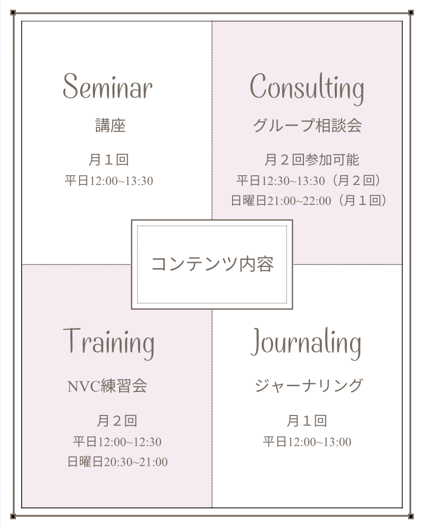 ※講座がない月はグループ相談会やワーク会、NVC練習会などを開催します。